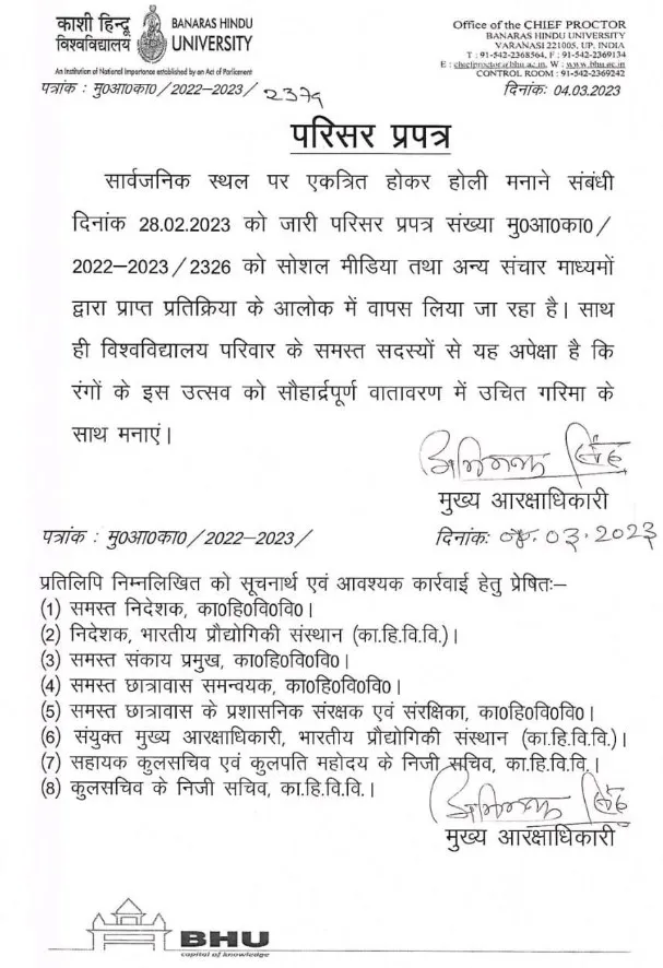 teamuppost 5 मार्च, 2023 परिसर में होली समारोह पर प्रतिबंध लगाने के लिए छात्रों के भारी विरोध और सोशल मीडिया पर तीखी आलोचना के बाद, बनारस हिंदू विश्वविद्यालय ने इस आदेश को रद्द कर दिया है। शनिवार, 4 मार्च को वाराणसी में बनारस हिंदू विश्वविद्यालय ने एक आदेश जारी किया जिसमें कहा गया कि सोशल मीडिया और अन्य मीडिया प्लेटफॉर्म पर प्राप्त प्रतिक्रिया को देखते हुए, विश्वविद्यालय ने परिसर में हिंदू त्योहार मनाने पर प्रतिबंध लगाने वाले अपने पिछले आदेश को वापस ले लिया है। विश्वविद्यालय के मुख्य प्रॉक्टर प्रोफेसर अभिमन्यु सिंह द्वारा जारी पाबन्दी को वापस लेने का नया आदेश जिसमें छात्रों से रंगों के त्योहार को पूरी गरिमा और सौहार्दपूर्ण माहौल में मनाने का आग्रह किया गया है.